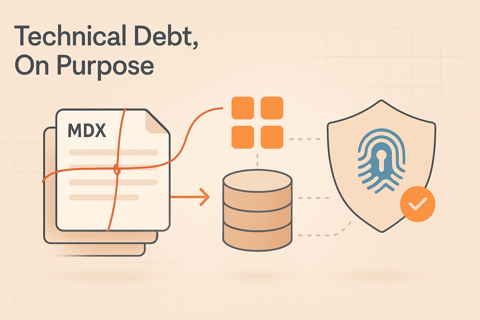 What ‘technical debt’ really is, when to take it, and how I’m evolving a file-based MDX workflow into a lean, server-side CMS with an editor, auth, and a relational database—without losing speed or portability.